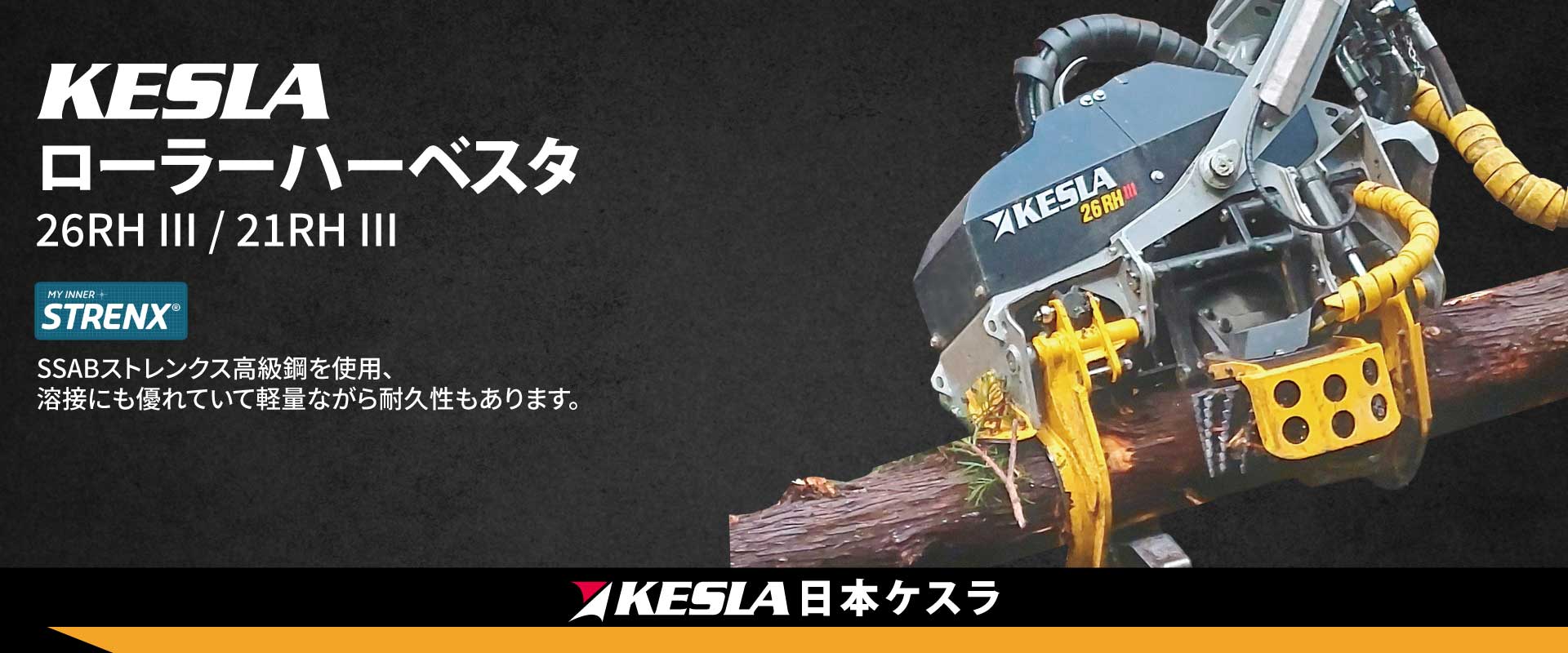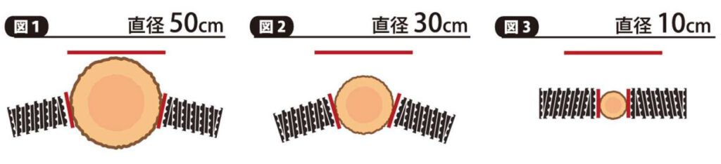 大径木はローラーが抱え込み木材の重量を支えます。(図1&2)木材自重でスムーズに送材するため、ヘッドと木材間の摩擦が最小限に抑えられます。小径木はローラーが向かい合って木材の両側から挟みます。(図3)枝葉のある梢側もしっかりグリップして惣菜しつつ、ヘッドと木材間の摩擦を最小限に抑えます。