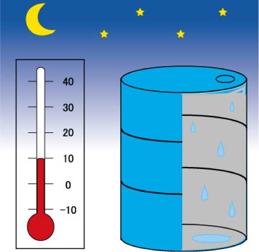ドラム缶内部は夜間の外気温低下によって結露が発生。