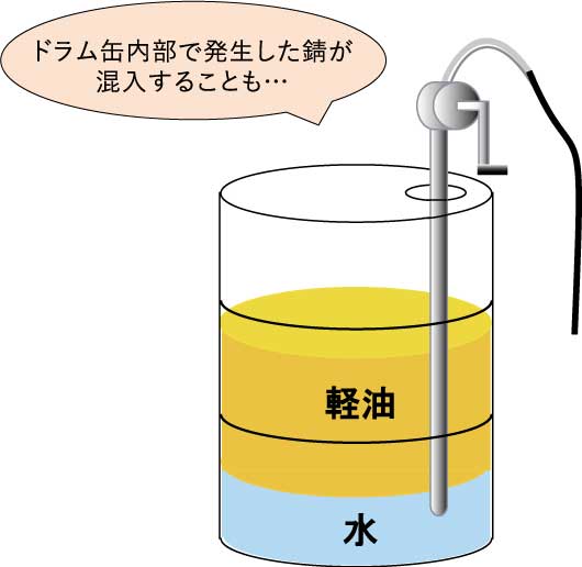 結露した水はドラム缶底部にたまり、注油時に燃料と一緒に水(結露水)が混入します。